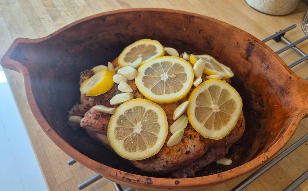 Tørk kyllingen og rubb den inn med Kystdrømkrydder. Ha 2 ss olivenolje i bunnen av en leirgryte eller annen gryte som tåler stekeovn. Kutt sitronen i skiver, og skrell hvitløksfeddene. Fordel dem rundt og på kyllingen. Drisle resten av oljen over. Sett kyllingen i stekeovn på 100-120'c, avhengig av om du skal ha kyllingen i ovnen hele dagen, eller bare 4-5 timer. Hvis du setter den inn om morgenen før du går på jobb, kan du la den steke på 100'c.